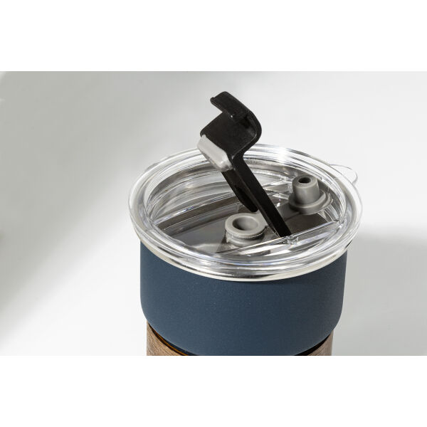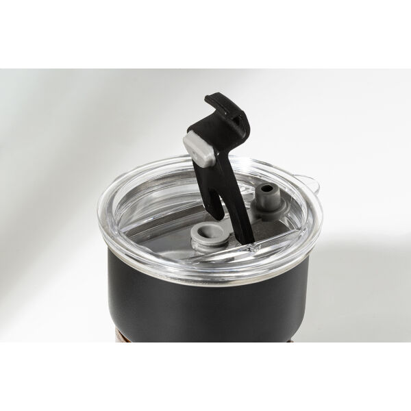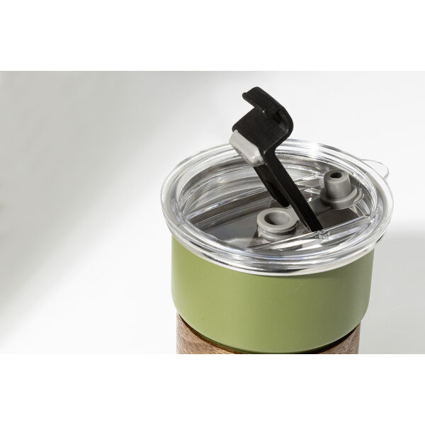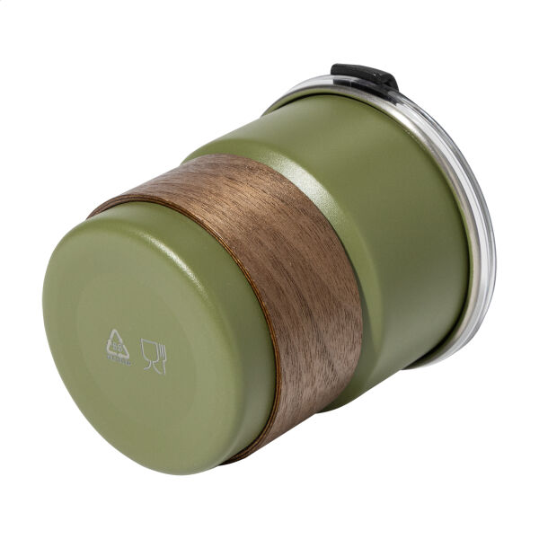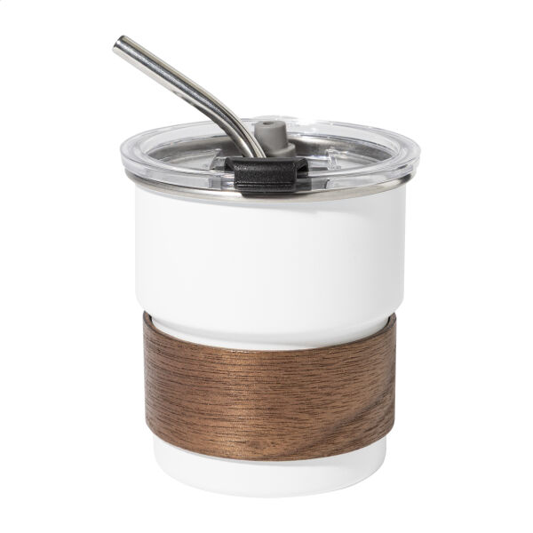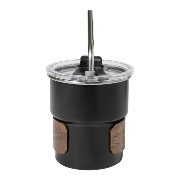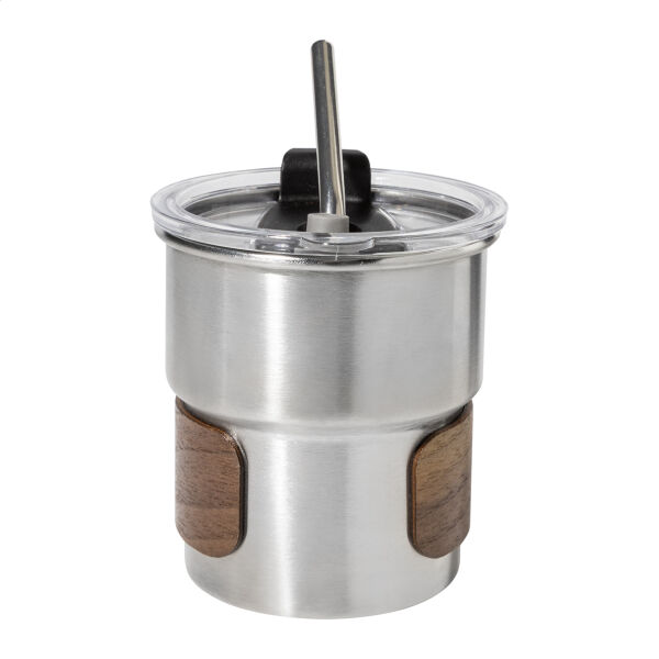 Enkelwandige, gerecyclede roestvrijstalen reisbeker met handgreep van notenhout, plastic drinkdeksel en gerecycled roestvrijstalen rietje. 260 ml.